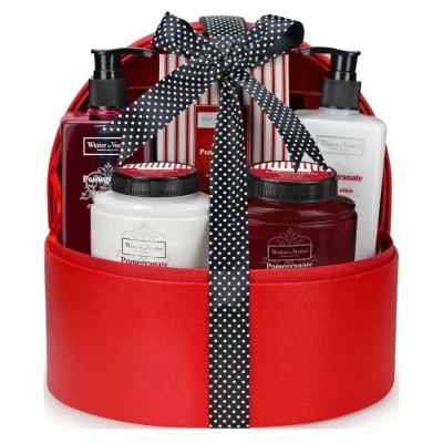 Presented in a Reusable Jewellery Case Shower Gel 345ml Body Lotion 345ml Bath Soak 190ml Hand Cream 190ml Bath Salts 200g Rose Shaped Body Puff Dimensions: 25 x 14 x 24 cm Weight: 1.2kgs.